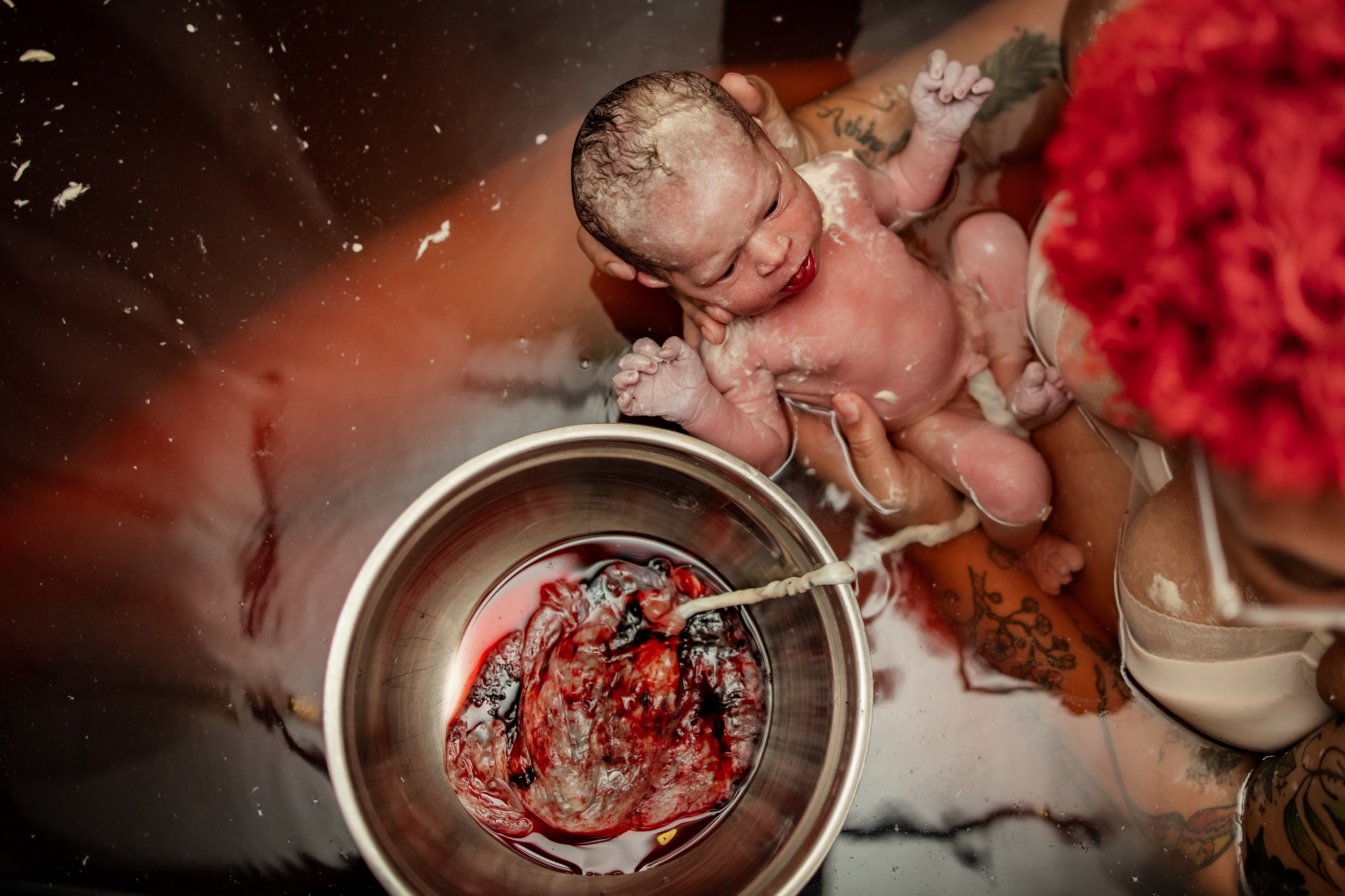 "This striking image comes from a free birth, capturing the moment this mother was working to deliver her placenta after welcoming her baby. While most of it had released, a small portion seemed retained. With calm and trust in her intuition, she called her midwife from a previous birth for guidance. A simple suggestion, to cough, helped her body release what remained. Everything resolved smoothly, and this moment is a testament to her courage, wisdom, and strength as she navigated each stage of birth."